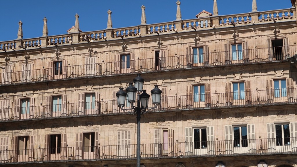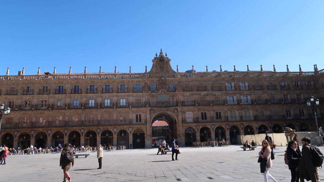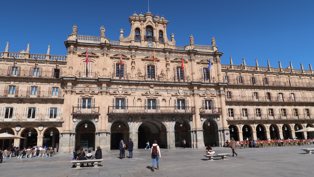 Plaza Mayor is one of the most beautiful squares in Spain. It was built in Baroque style according to the plans of Alberto Churriguera. On the north side is the City Hall, a Baroque building that has five granite arches and a steeple decorated with allegoric figures. In its decoration several medallions stand out, including those of Charles I, Alfonso XI, Ferdinand VI, Cervantes and St. Theresa. The façades of the buildings are three storeys high, with semicircular arches and balustrades. Today, this square is one of the most lively and popular places in Salamanca.